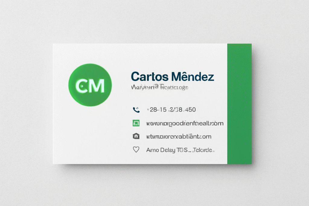 Este diseño destaca por su estética limpia y minimalista. La tarjeta utiliza un esquema de colores en verde y blanco, con un logo circular que refuerza la identidad visual. La disposición organizada y la tipografía clara aseguran que la información de contacto sea fácil de leer y profesional.